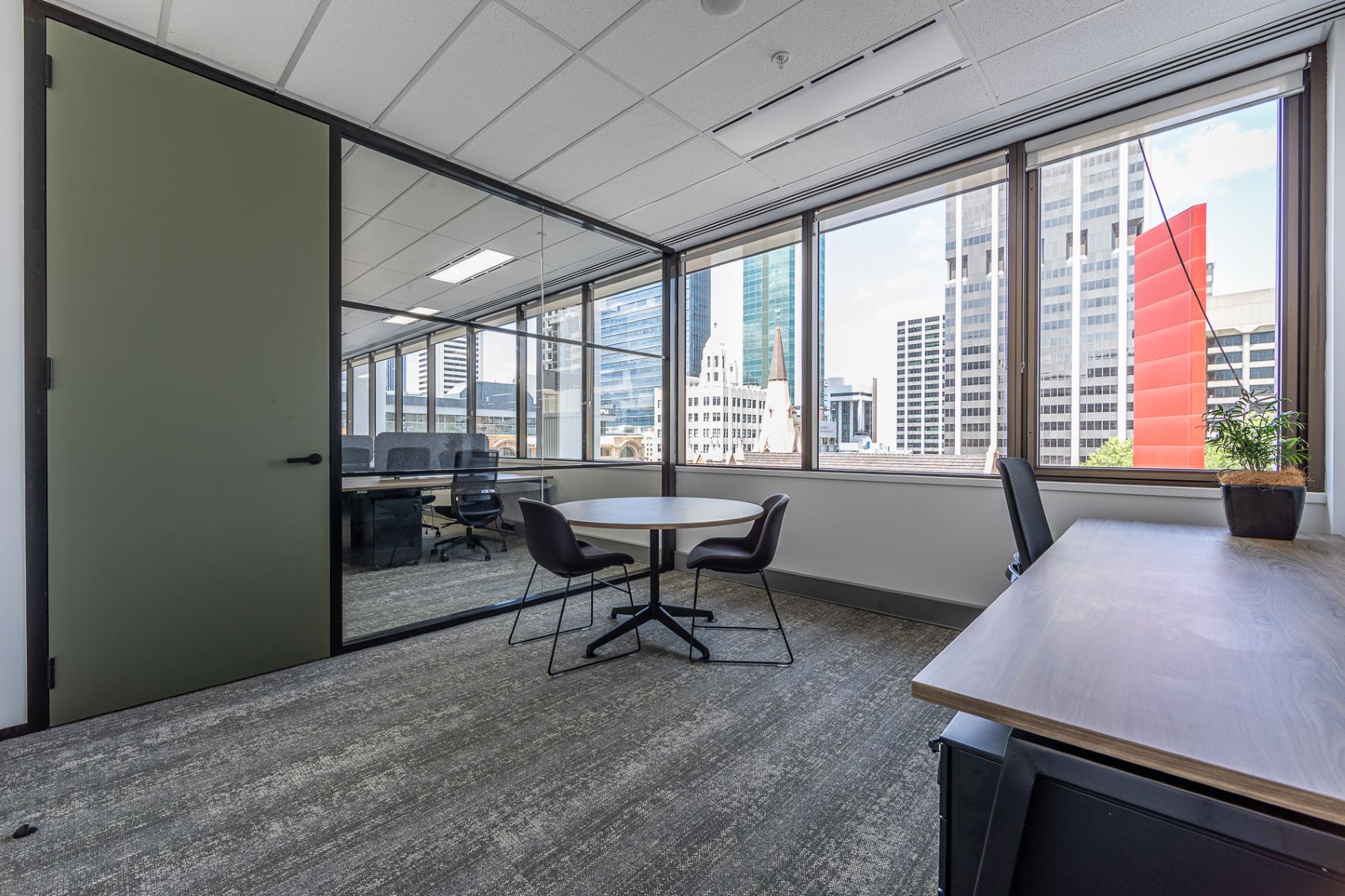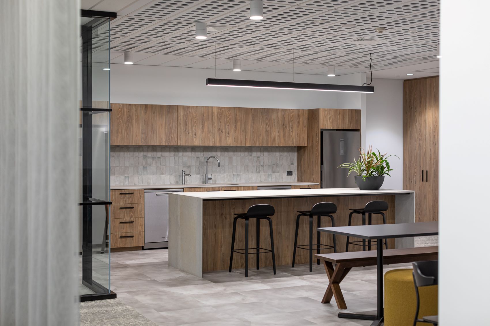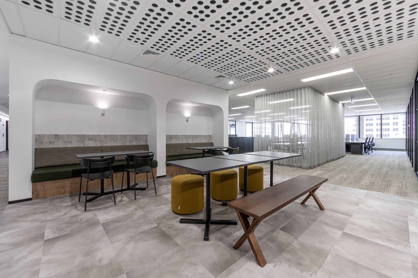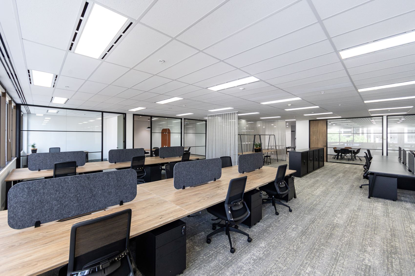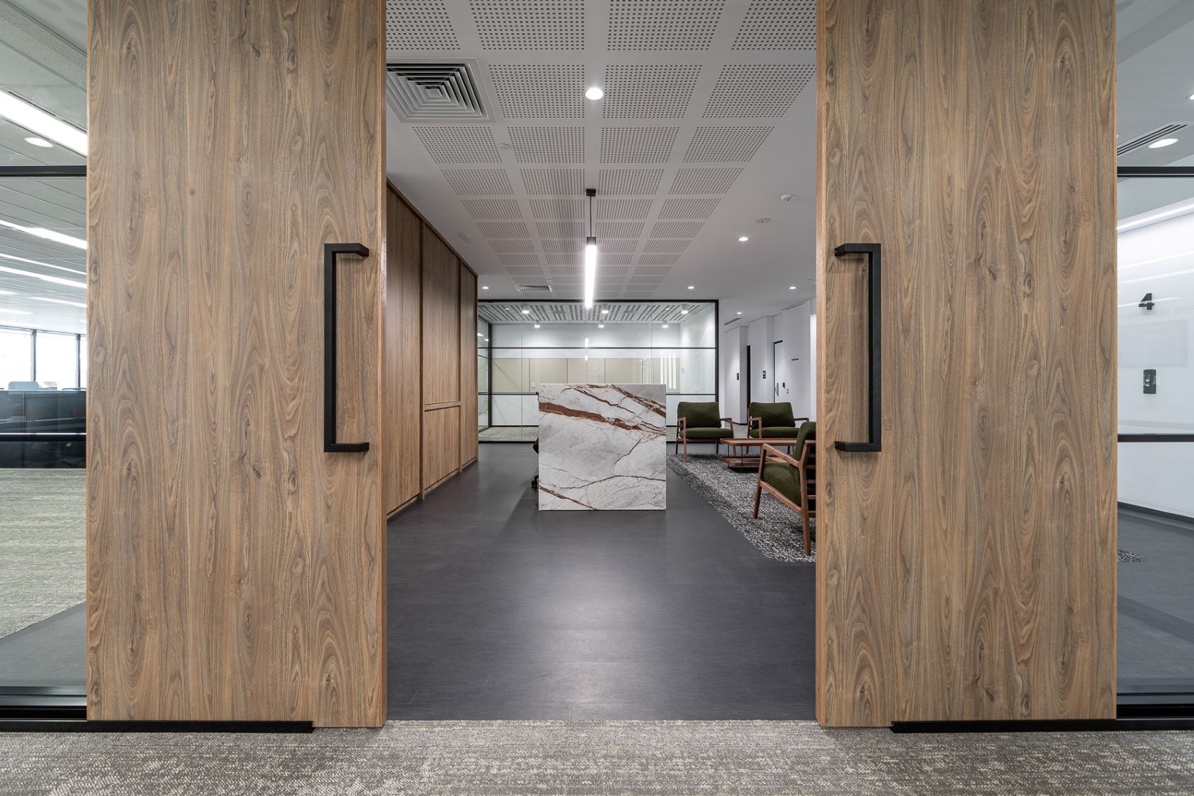 The Wesley Quarter Show Suites project started with a full floor stripout in an occupied building. The new build featured open plan workstations, an inviting reception area with a wraparound waterfall feature stone, timber joinery, meeting rooms, collaboration areas, a large breakout and dining space, and improved acoustics. Upgrades included new floor coverings, fire protection, and lighting system transition to LEDs, and custom modifications to the air boots resulting in a 12% increase in air flow. All care was taken for minimal disruption to all in the building while the works were being carried out.